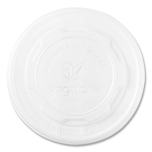Flat lid for Vegware™'s 115-Series soup containers. A practical no-hole lid for hot soups or stews. Made from CPLA, a renewable material made from plants. Award-winning quality by Vegware™, made from plants. Commercially compostable where accepted.