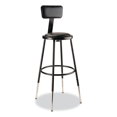 The fortified construction and soft comfort of the 6400 Series heavy-duty padded stools with backrests are ideal for hands-on educational settings like art rooms, science labs, home economics or shop classrooms. These reliable stools feature a sturdy frame of 18-gauge steel tubing securely welded to a 14 inch diameter seat pan. Riveted through the steel pan are 0.5 inch thick vinyl cushioning that will provide years of dependable use. Footrest ring is securely bonded to each leg with four spotweld contact points. Height-adjustable legs extend from 25 inches to 33 inches in 1-inch increments and adjustable padded backrests can be moved two inches up/down and forward/back.