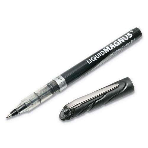 The Liquid Magnus roller ball pen contains water- and fade-resistant acid-free liquid pigmented ink for the exceptionally smooth writing experience of a gel pen combined with the strength and durability of a ball point pen. Permanent pigmented ink helps prevent document and check tampering, as the ink cannot be lifted off the paper using common chemicals. Designed for precise writing even through carbon copies, these pens write with clean, distinct lines. Visible ink supply helps monitor ink levels over time. Ink reservoir encompasses the whole barrel body for larger ink capacity and write time. The texturized rubber grip provides great writing control and comfort, while not containing latex or phthalate. Color coded end cap includes flat metal clip.
