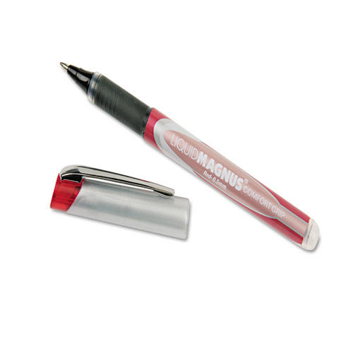 The Liquid Magnus roller ball pen contains water- and fade-resistant acid-free liquid pigmented ink for the exceptionally smooth writing experience of a gel pen combined with the strength and durability of a ball point pen. Permanent pigmented ink helps prevent document and check tampering, as the ink cannot be lifted off the paper using common chemicals. Designed for precise writing even through carbon copies, these pens write with clean, distinct lines. Visible ink supply helps monitor ink levels over time. Ink reservoir encompasses the whole barrel body for larger ink capacity and write time. The texturized rubber grip provides great writing control and comfort, while not containing latex or phthalate. Color coded end cap includes flat metal clip.