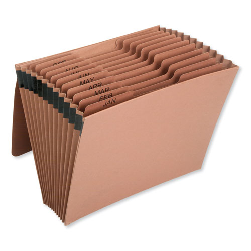 Increase your efficiency with this letter-size expanding file featuring 12 tabs for monthly filing. The accordion-style pocket folder is covered with soil-resitant leather-patterned paper and is durable to stand up to heavy handling.