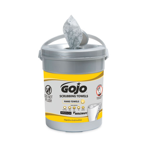 GOJO® SKILCRAFT® Scrubbing Towels are heavy-duty and designed to tackle tough cleaning jobs including heavy soils, tar, grease, and adhesives. Dual-textured, pre-moistened towels work to scrub away dirt and soils.
