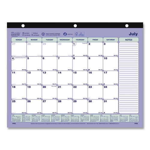 13-Month Academic Desk Pad Calendar, July to July. Reinforced chipboard backer. One month on each sheet, one block per day. Notes section on each page. Tear-off sheets, bound at the top and perforated. Yearly calendar reference at the bottom of each sheet. Non-refillable pad. Julian dates. Three-hole punched for binder use or hanging.