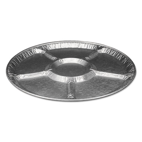 Aluminum embossed lazy susan serving trays provide uncompromising foil quality along with an optimal display of goods. Handle freezer to oven temperatures. Used for hot or cold foods. Perfect for buffet settings.