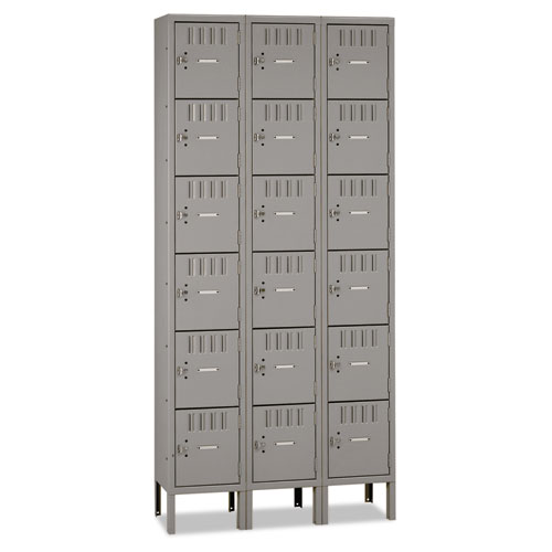 Industrial strength steel box lockers are ideal for securely storing smaller items like purses, lunches, books, and athletic gear. Six tier high locker units with 6" legs. Lockers are 12 "w x 18" d x 12 h. Tough, powder-coated finish keeps its good looks for years.