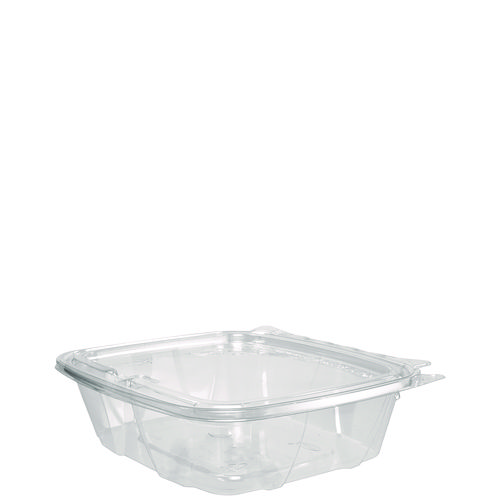No matter what's inside, these containers keep your food safe, secure and looking good! Designed to prevent tampering without shrink bands or extra wrapping, our containers make sharing food easy. Keep contents fresh and prevent leaks with the secure perimeter seal. The tamper alert hinge has a visible seal that, if broken, makes it obvious the container has been opened. The specialty lid inhibits the ability to lift it from the base without tearing the hinge. Once the seal is broken, the now two-piece container is easy to re-close and continues to be leak-resistant. Make sure your food is the star of the show thanks to the crystal-clear material. Merchandising and delivery is a breeze with the sturdy stackable design. They're even great for at-home use. Transport salads, fruits, or desserts to your next picnic, potluck, or bake sale. Made with 100% post-consumer recycled content.