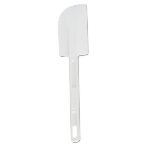 Food scraper and spatula features a true rubber blade molded directly onto the handle. This construction prevents bacteria and dirt build-up, providing a safer kitchen experience. The rubber spatula is entirely white and stain resistant. Each spatula is safe for use with commercial dishwashers. The seamless construction allows for a permanent bond.