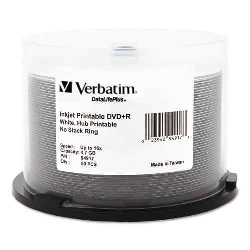 Dvd+r Recordable Disc, 4.7 Gb, 16x, Spindle, Hub Printable, White, 50/pack