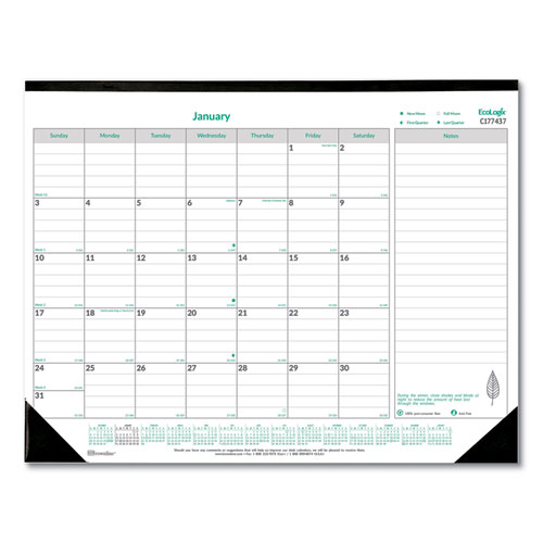 Designed with the future in mind with an eco-friendly tip each month. Ruled daily blocks, note space and a full-year reference calendar for future planning. Perforated sheets for easy removal. 100% post-consumer recycled paper.