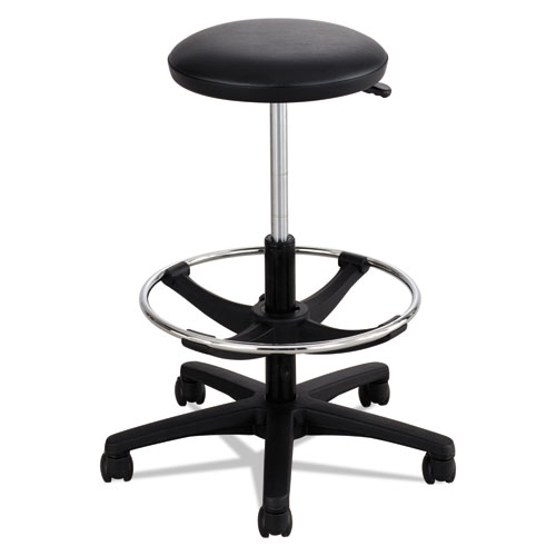 A user-friendly addition to any work environment. Features a comfortable ergonomic seat and foot ring height adjustment to perform a variety of tasks. Its adjustable-height, chrome foot ring may provide pressure point relief, muscle relaxation and improved circulation. The seat is padded and upholstered in highly resistant and easy to clean material. Featuring a 360-degree swivel and a five-star base outfitted with dual wheel casters, the stool allows you to move in either direction, and glide across carpet and hard flooring with ease.