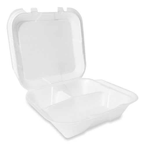 Foam Hinged Lid Container, Secure Two Tab Latch, Poly Bag, 3-Compartment, 9 X 9 X 3, White, 100/bag, 2 Bags/carton