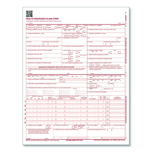 CMS Health Insurance Claim Form, Two-Part Carbonless, 8.5 x 11, 100 Forms Total
