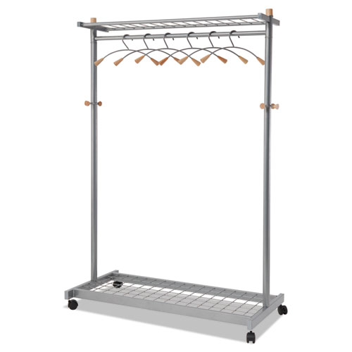 - Garment Racks, Two-Sided, 2-Shelf Coat Rack, 6 Hanger/6 Hook, 44.8w x 21.67d x 70.8h, Silver/Wood