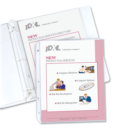 Sheet protectors are widely used as a tool to keep documents in their original condition. Once inserted into the holder, the documents instantly have a plastic, protective cover, which will help eliminate damage and tearing while they are being stored. This is especially important for high-use documents that are accessed on a regular basis. Document holders have strong, reinforced edges, which prevent tears. Top-loading sheet protectors are pre-punched to fit standard three-ring binders. This allows for documents to remain in their original state. The acid-free polypropylene material eliminates photocopy transfer. Sheet protectors are a durable storage option for important documents and reference materials. This product will be cheerfully replaced with one of equal value if defective in materials, manufacturing or packaging at the time of purchase. Except for such replacement, this product is sold without warranty or liability even though defect, damage or loss is caused by negligence or other fault.
