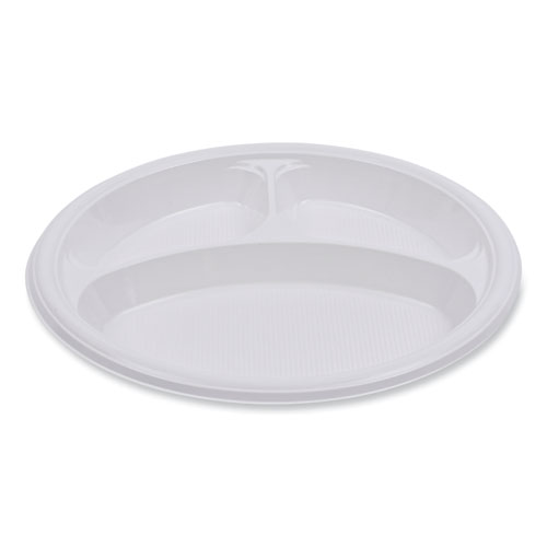 Hi-Impact Plastic Dinnerware, Plate, 3-Compartment, 10" Dia, White, 500/carton
