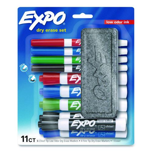 Low-Odor, Dry Erase 10-Color Marker and Eraser Set, Broad Chisel/Fine Bullet Tips, Assorted Colors, 11 Pieces/Set