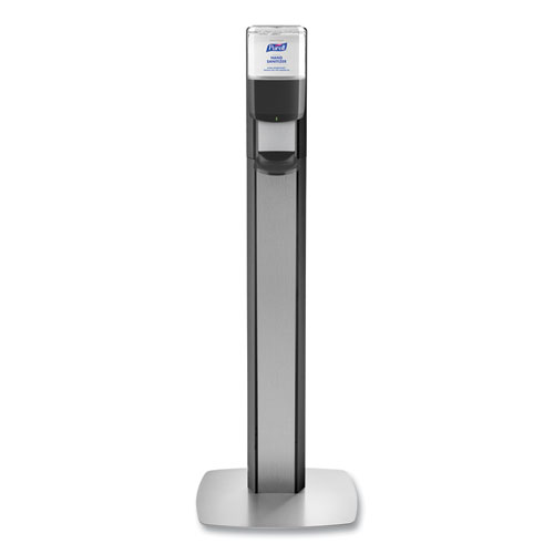 Elegant stand makes PURELLĀ® Hand Sanitizer available anywhere. May be personalized with you message on the front and back of the stand. Low profile baseplate designed to maximize stability. Lightweight and easily moved when cleaning the facility. Silver baseplate hides dirt and always looks good.
