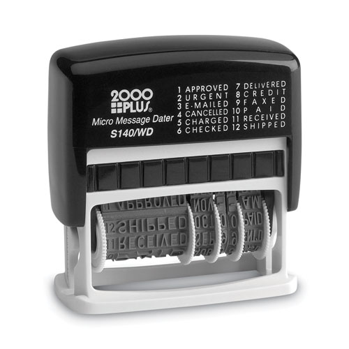 Key business phrases make this dater even more effective. Phrases include: APPROVED, URGENT, E-MAILED, CANCELLED, CHARGED, CHECKED, DELIVERED, CREDIT, FAXED, PAID, RECEIVED, SHIPPED. Four-band date: months, days and five-year band. Use phrase and date together or separately. Plastic frame. Includes snap in/out, cartridge-style black ink pad. Type size 1.
