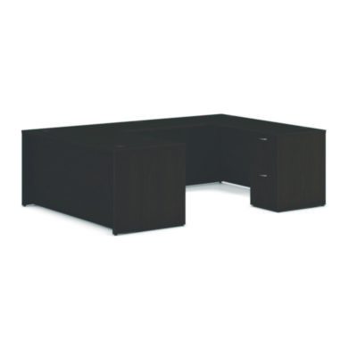 Mod offers any workspace, big or small, straightforward, no-nonsense design, exceptional durability and versatility that stands the test of time. With triple the desktop space as well as dual support pedestals, this U-station delivers on performance, adaptability, and aesthetics. Cancel cord confusion with handy desktop grommets designed to organized power and data cables. Avoid scratches, spills, and stains with a durable, easy-to-clean laminate. Steel ball-bearing drawer suspensions operate easily and quietly. Bundle includes a Mod Desk Shell, two Mod Supporting Pedestals, a Mod Credenza Shell and a Mod Bridge.