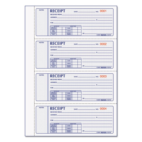 Money Receipt Book, Hardcover, Three-Part Carbonless, 7 x 2.75, 4 Forms/Sheet, 200 Forms Total
