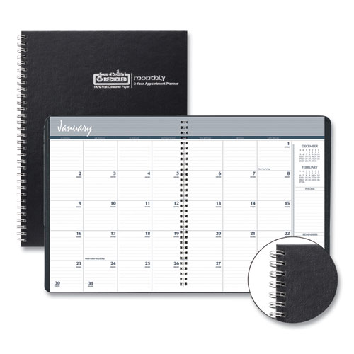 Monthly planner with a durable hard cover that folds over to create a sturdy writing surface. Includes a double-sided storage pocket. The planner is bound strongly with wire binding to withstand daily use throughout the year. Includes Julian dates with days remaining. One month per two-page spread with future and previous reference calendars. Made entirely of recycled materials.