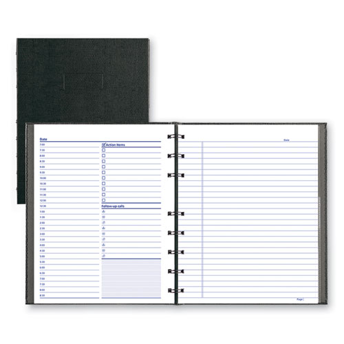 Durable hard cover with twin wire binding. Action item list and phone log on each page spread, appointment schedule in 30-minute intervals and lined note space on left-hand pages. Includes self-adhesive tabs and storage pocket.