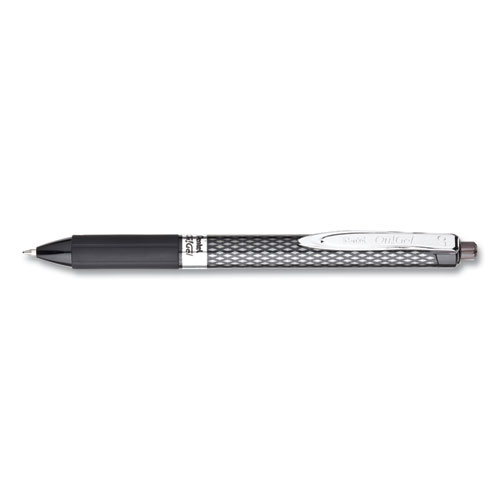 The PentelĀ® Oh! Gel retractable gel pen features acid-free, permanent gel ink that delivers a memorably smooth writing experience. The latex-free grip provides extended comfort and control when writing. The stylish carbon fiber look gives this pen unique appeal. It is available with a 0.7mm metal tip that writes medium lines.