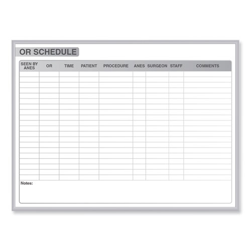 Ghent's graphic whiteboard is visually enhanced to encourage communication and collaboration. Ghent's OR schedule board helps keep track of surgeries and patient details for your operating room. There is plenty of room to write in each patient's procedure details. The graphics on the erasable board improves communication and reduce anxiety for patients and employees. The entire dry-erase surface easily wipes off with a soft cloth, disinfectant wipe, alcohol or water. Ghent's graphic whiteboards are resistant to bacteria and germs, which helps with infection prevention. Each board comes in a sleek 0.25 aluminum frame and includes a detached SmartPak tray. Graphics are produced in gray to seamlessly match any interior and will never stain, ghost or fade. Ships to you in Ghent's worry-free packaging, designed specifically for shipping whiteboards.