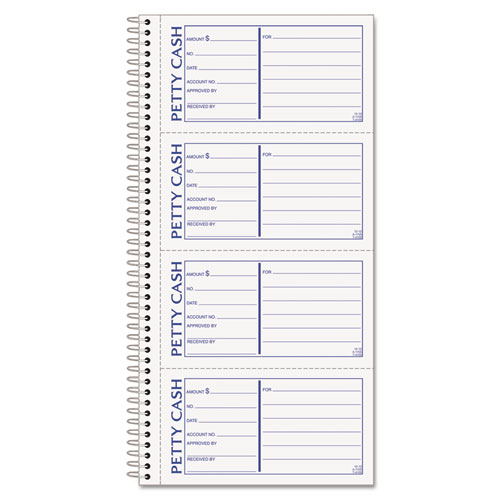 Spiralbound book keeps permanent record of cash disbursements. Space for date, amount, approval, account and number. Six writing lines to state purpose of petty cash. White with canary duplicate.
