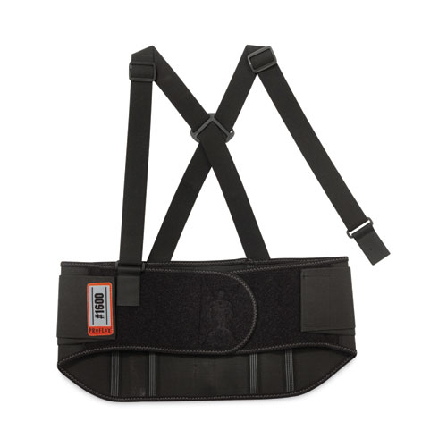 The ProFlex 1600 Standard Elastic Back Support Brace is designed to remind workers of proper lifting techniques while also enhancing the body's intra-abdominal pressure, moving the stress away from the spine for back-pain relief. Premium, all-elastic body with a 9 wide belt provides extra-firm support, and a contoured, high-cut front panel delivers a more comfortable fit. Before lifting heavy objects, simply tighten the support belt to enhance the body’s intra-abdominal pressure; and after lifting, just loosen the belt to achieve a wider range of motion. Secure-fit, interior rubber-track webbing prevents the belt from riding up when bending or lifting. Innovative Power Panel Positioners keep the tension bands close-to-hand, making it easy to get the desired level of tension. Non-conductive polypropylene stays help ensure long-lasting integrity. Adjustable, detachable suspenders allow the wearer to tailor the shoulder-fit to his or her unique needs. For best results, the support should fit snugly around the wearer's hips, with the front of the support two-fingers below the wearer's navel. When worn correctly, workers can easily maintain the proper posture for lifting, while achieving the extra support required to safely complete the task. Easy-to-use hook-and-loop closure keeps the belt securely fastened while in use. Brace can be worn over or underneath clothing. Machine washable—machine-wash cold and air dry.