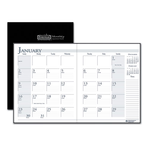 Stitched-book-style flat planner, with room to record necessary appointments and general information, is ideal for the busy professional. One-month per two-page spread with generous note space for important information. Lightly ruled daily blocks help keep notations neat. Includes numbered weeks. Additional information sections include important holiday dates, a three-year reference calendar and a lined contact-information page. Made entirely of recycled materials.