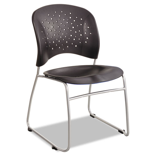 Perfect for extra seating in offices or to greet guests in meeting, break and conference areas. Contoured, round back provides lumbar support while the perforated back gives it breathability to ensure comfort. Stacks up to 12 high for easy storage when not in use. Chair is accent by silver sled base.