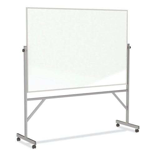 Constructed for strength and durability, Ghent's Reversible Magnetic Porcelain Whiteboard with aluminum frame and stand is a versatile mobile communication tool for a range of environments. The scratch- and dent-resistant porcelain-on-steel surface ensures that your dry erase board never absorbs ink, eliminating the possibility of staining and ghosting; and as the surface is magnetic, you can also incorporate magnetic clips, characters and a variety of board accessories to accomplish any number of display and instructional goals. The reversing mechanism simplifies flipping from one surface to the other, and the strong steel positioning locks clamp-down securely, allowing you to set the surface fully vertical or to any angle in-between. Robust aluminum frame and stand deliver reliable performance, and the stand’s leg braces provide extra stability. Twin-wheel swivel casters keep you mobile; and by making use of the two locking casters, you can keep the board in place where you intend to use it. Ships to you in Ghent's worry-free packaging, which is designed specifically for keeping mobile dry erase boards safe during shipping.