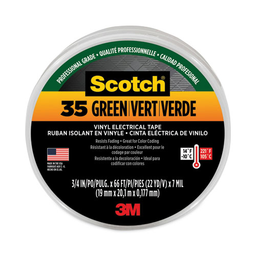 Scotch 35 Vinyl Electrical Color Coding Tape, 3" Core, 0.75" X 66 Ft, Green