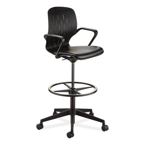 The easy-to-use Shellâ„¢ Extended-Height Chair provides intuitive adjustments and a sleek design that suits any workspace. Featuring a contoured back for lumbar support and a frame that naturally flexes to fit the individual user, this drafting chair is great for long work days. For additional comfort, the seat and arms are available with upholstered padding. The seat's back includes stylish holes that provide comfortable breathability during use. Upholstery is vinyl, making it easy-to-clean. The seat height of this chair is easily adjustable from 22" to 32" to suit a wide range of user heights. This height pairs perfectly with standing or adjustable-height desks to help encourage a more active, yet comfortable, workday. The flat footring around the base provides an ergonomic support while sitting, and is adjustable to suit the needs of the user. A sturdy, five-star base with casters and 360-degree swivel capabilities ensures the user can move and reach anything they need throughout the day. Great for use in personal workspaces, computer labs, home offices, design studios, architecture firms, warehouses, conference rooms or anywhere else an extended-height chair is needed.