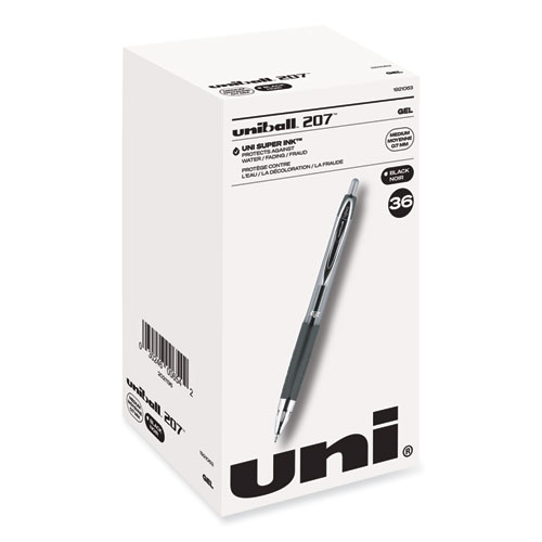 Stock your office, home or classroom with 207 Retractable Gel Pens from uni-ball available in various point sizes with a stainless steel tip that resists bending and breaking. Even-flowing, pigment-based gel ink delivers a smooth writing experience for intense, vibrant lines, ensuring that every mark is brilliantly communicated. Use these retractable gel pens for everyday writing tasks, check signing and all of your important signatures, trusting its quick-drying uni Super Ink. Innovative uni Super Ink technology effectively entraps the gel ink into the paper, producing fraud, fade and water-resistant documents that resist check washing or bleaching. A textured grip offers greater comfort and control as you continue writing, while a translucent ink window indicates the level of gel ink remaining, so you don't run out unexpectedly. The sleek design of the 207 with modern metal accents gives the retractable gel pen a stylish touch.