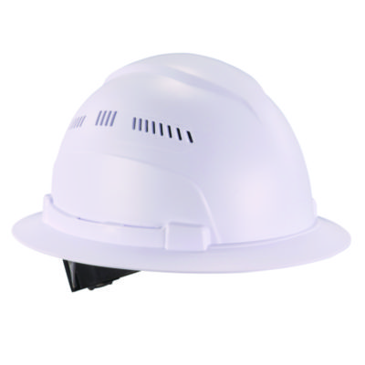 The Skullerz 8968 Class C Vented Hard Hat with 6-Point suspension provides lightweight yet durable protection to shield the top of the head from falling objects or bumping into stationary objects. This vented hard hat features a lightweight HDPE plastic shell for comfort without comprised protection. Compared to 4-Point suspension systems, the 6-Point suspension better disperses the force of an impact. For a custom and secure fit, it offers more adjustment points (36 in total) and pivots up and down to clear bandana or ponytail knots. This full brim style helps keeps rain away from the eyes and provides extra protection against falling or flying debris. It also offers all-around coverage from the sun. The ventilated, open frame design and always-open venting makes for a cooler hard hat by releasing heat buildup and allowing air to circulate—reducing perspiration in hot and humid working environments. Hat sizes 6.5-8.25 (head circumference: 21"-26").