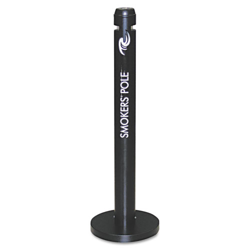 The Rubbermaid Commercial Aluminum Smokers Pole reduces obstruction in high-traffic areas. The round, vertical design is simple, yet sure to stand out in the vicinity for your patrons cigarette disposal needs. This weather-resistant ash tray features a UV-stabilized Uni-Koat powder-coated finish with a classic black color, making it suitable for a variety of outdoor environments. Made of durable aluminum, this cigarette bin is fire safe. Its chamber restricts oxygen flow, quickly extinguishing discarded smoking items, while its recessed extinguishing screen prevents extra ashes from dropping to the ground. These Smokers Poles feature simple mechanisms for emptying and maintenance, and no tools are required. A quick release push button detaches around the pole's midpoint for minimal bending. With a unique design and clean appearance that is covered to conceal waste, your patrons can easily deposit their cigarettes.