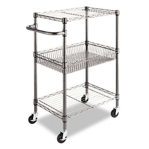 Three-Tier Wire Cart with Basket, Metal, 2 Shelves, 1 Bin, 500 lb Capacity, 28" x 16" x 39", Black Anthracite