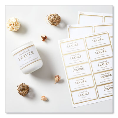 Remarkably reflective and elegant, Avery matte white rectangle labels with metallic gold borders bring a strikingly radiant shine to any event or project. Each rectangle label is pre-printed with a brilliant gold foil-like border that is guaranteed to capture people's attention. Avery Easy Peel technology makes it simple and easy to peel and place multiple labels quickly. Just bend back the label sheet to expose the pop up edges to peel away each label without risking ripping or tearing. Using a strong permanent adhesive, every label can stick and stay to a variety of surfaces including cardboard, envelopes, paper, glass, metal and more. Create beautiful designs and make your own address labels, wedding RSVP labels, party favor labels, product labels, food labels, holiday cards and more using the free design software and templates at avery.com/templates. Compatible with both laser and inkjet printers.