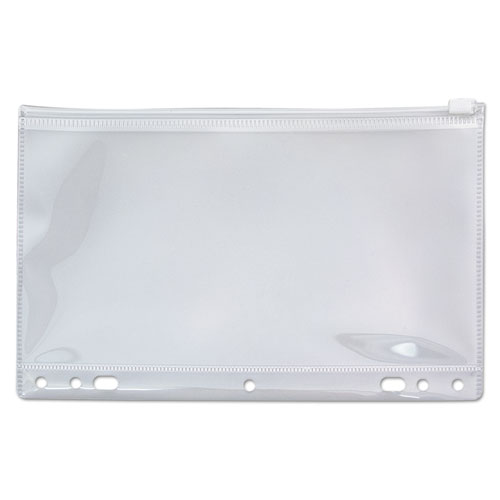 The binder pocket will safely secure your desk supplies! Keep writing instruments, paper clips and various loose items neatly contained and close by. Features heavy, clear matte polypropylene body with a plastic snag-proof zipper pull. Hole-punches allow use in various size binders. Heat sealed edges ensure contents remain secure.